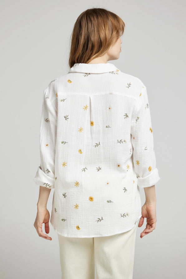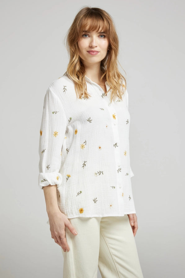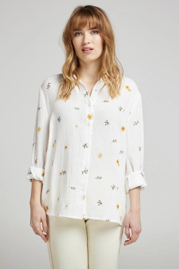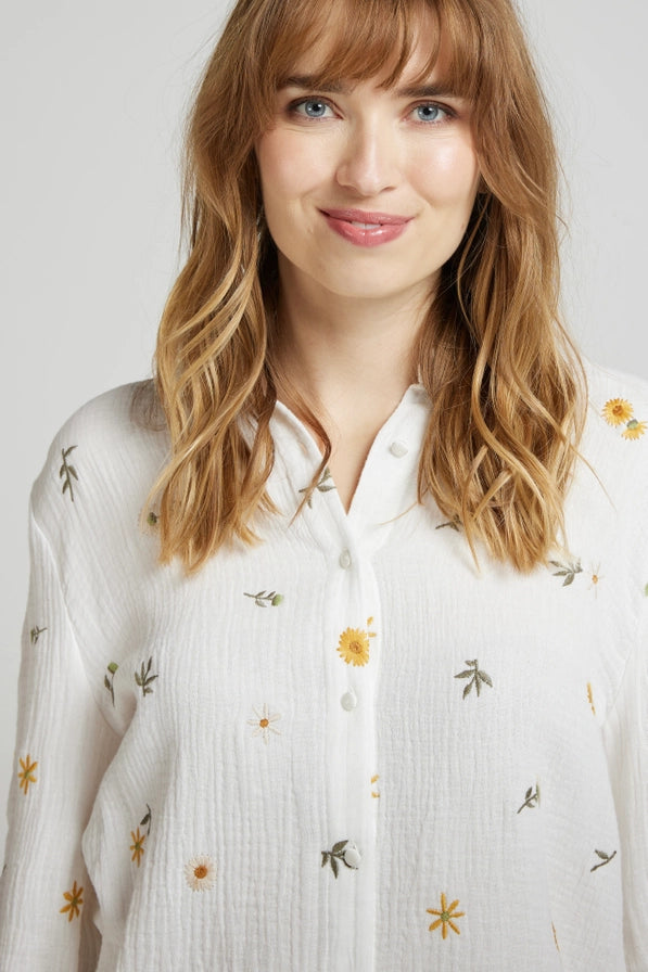 Låt din sommarstil blomstra med denna krämfärgade skjorta i mjuk och luftig bomullsgas. Skjortan är elegant dekorerad med delikata blombroderier som ger ett subtilt och feminint uttryck. Den lätta strukturen gör plagget behagligt att bära även under varma dagar, samtidigt som den ger en naturlig och avslappnad siluett.