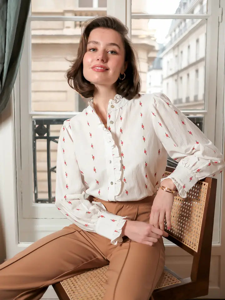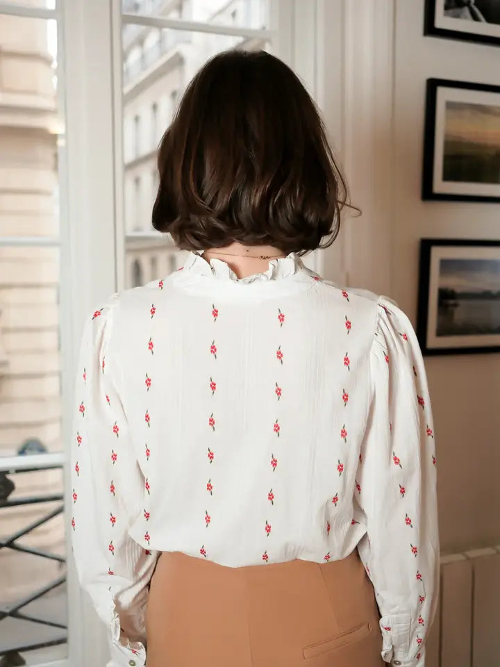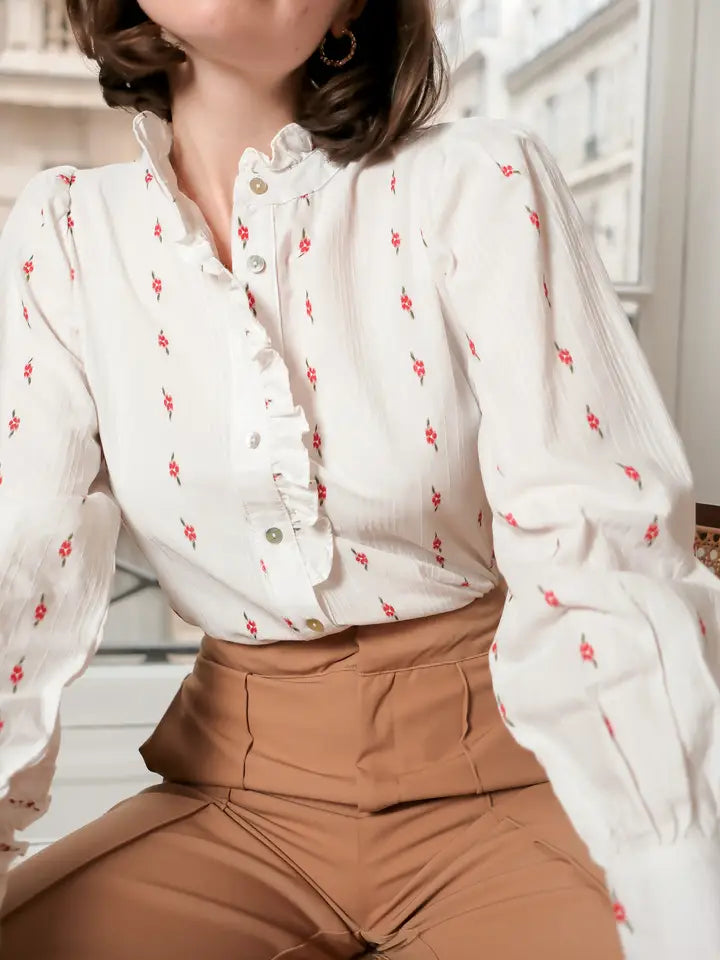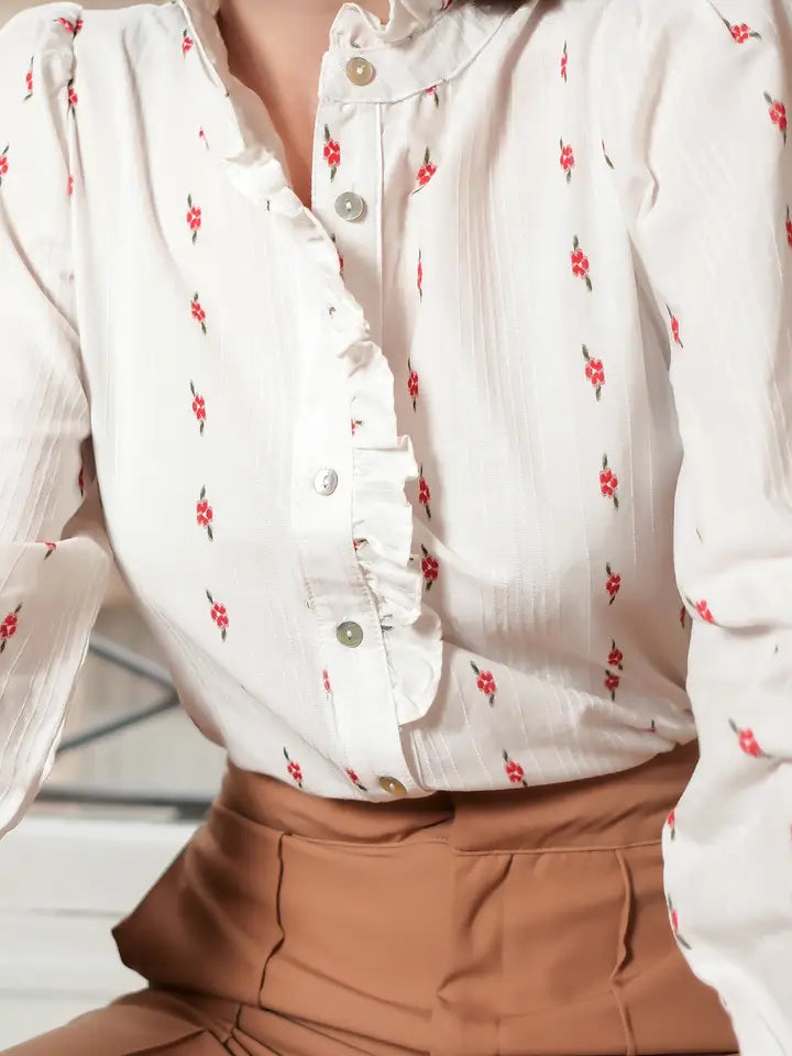 Blus med små blommor, volanger på knappslån och ärmslut