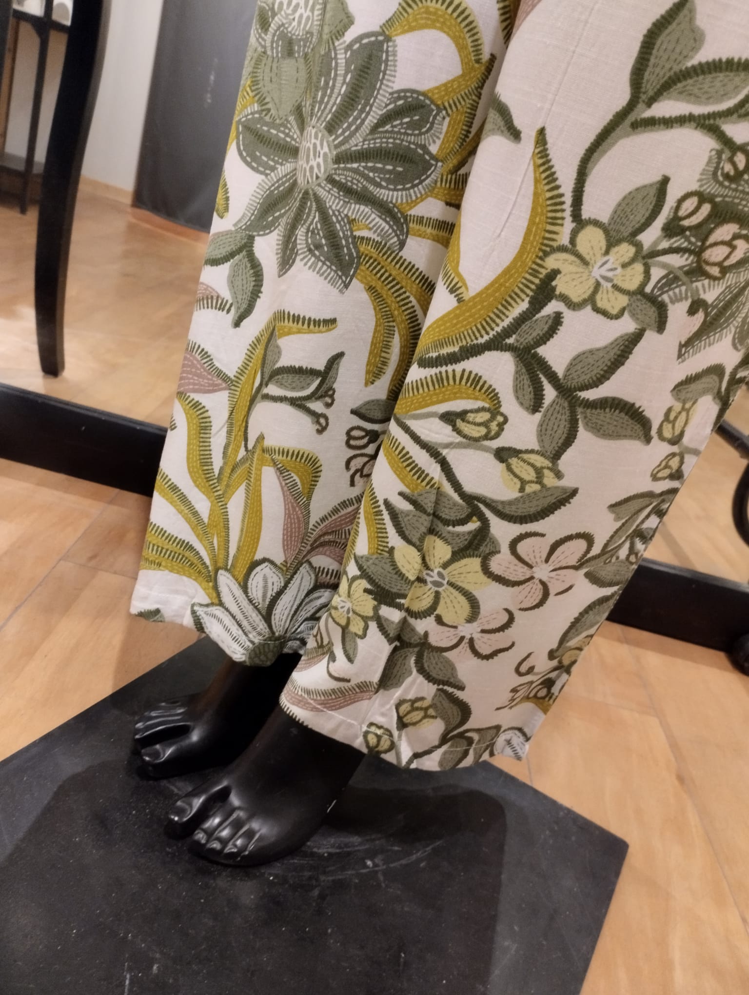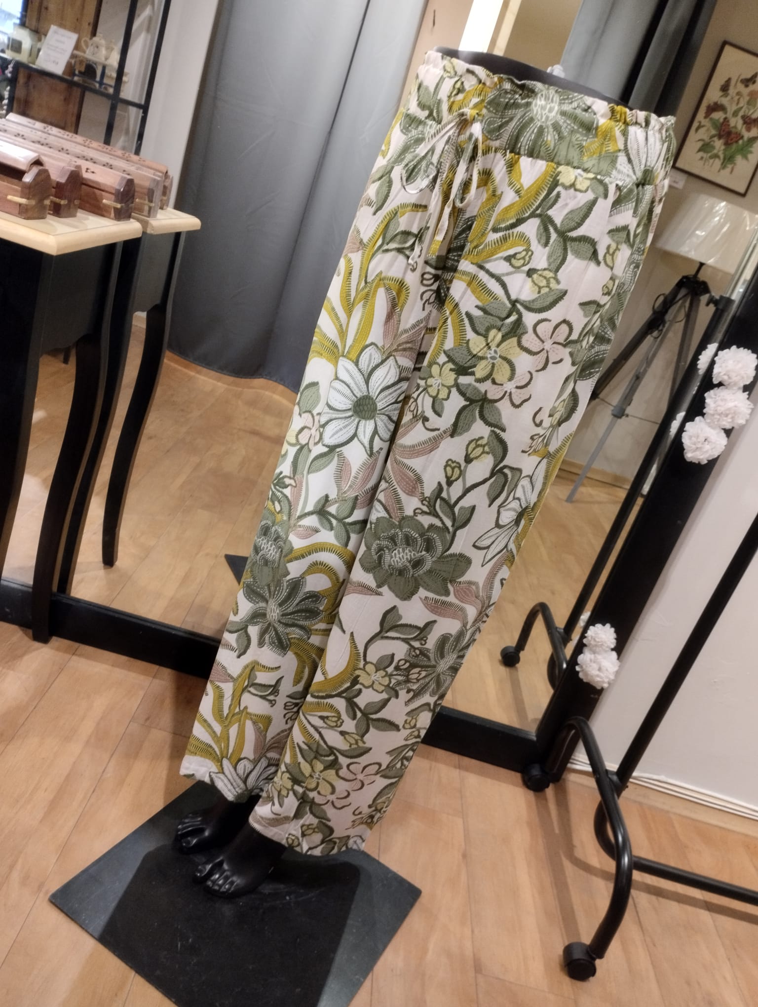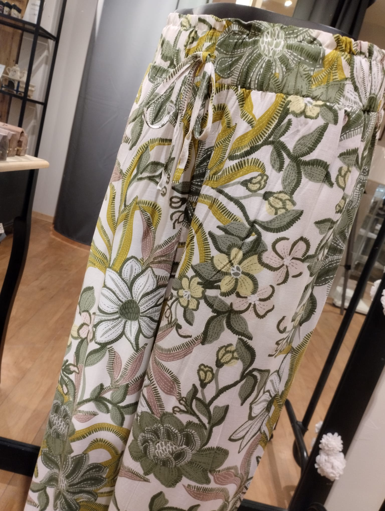 Layla blommiga byxor med fickor i grönt – en perfekt kombination av komfort och stil. De mjuka tygerna och det lekfulla mönstret gör dem till ett självklart val både till vardags och vid avslappnade tillfällen.