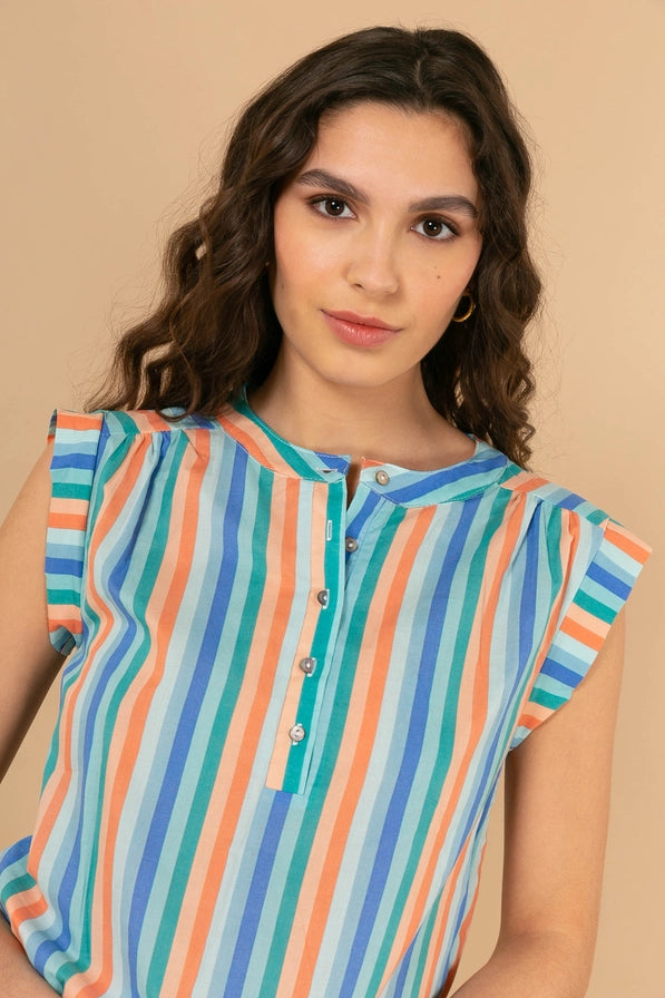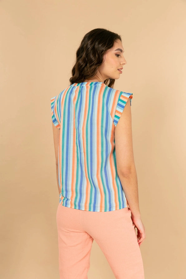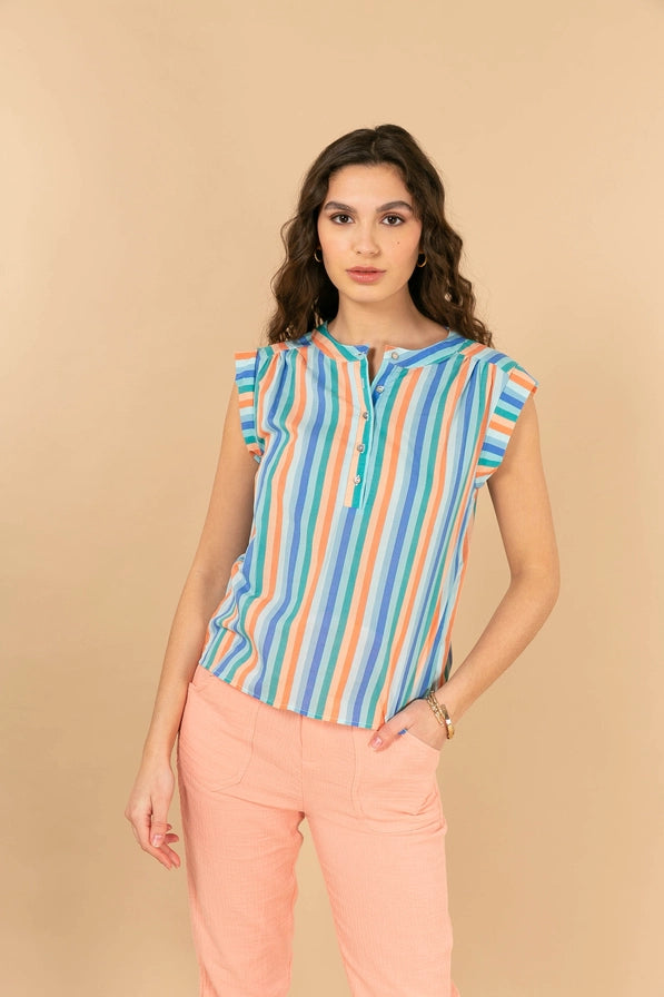 Lätt och livfull! Denna ärmlösa topp i 100 % bomull är perfekt för varma dagar. Toppen har färgglada ränder, veck vid axlarna som ger en feminin silhuett, samt en rund halsringning och en dekorativ knapp framtill för en extra detalj.