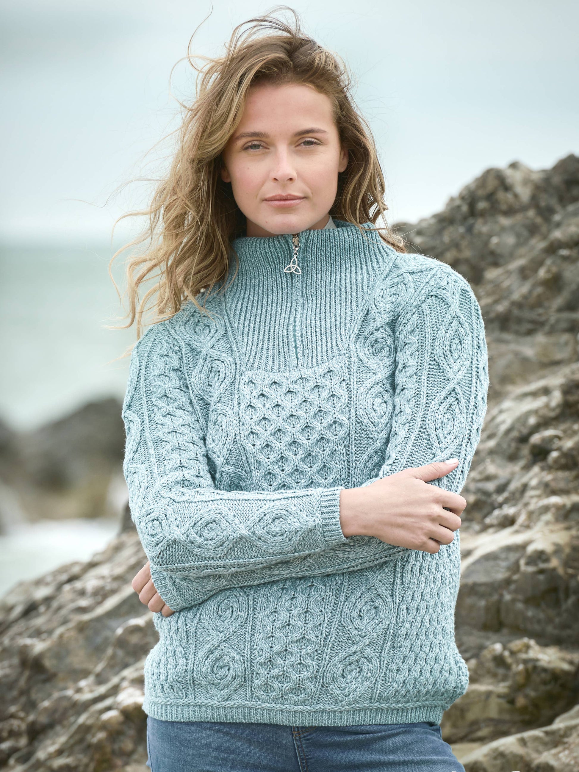 Kvartziptröja, stickad med lyxigt mjuk merinoull. Stickad med en kombination av olika traditionella Aran-sömmar, honungskaka, diamant och kabelsömmar genom hela tröjan med ribbsöm på kragen.