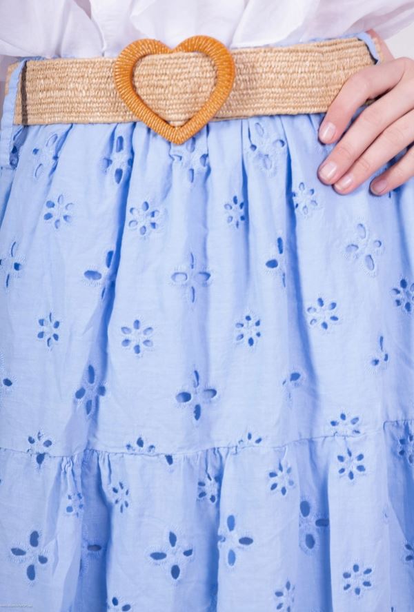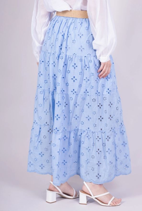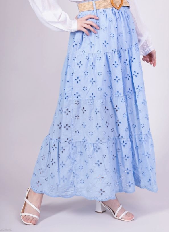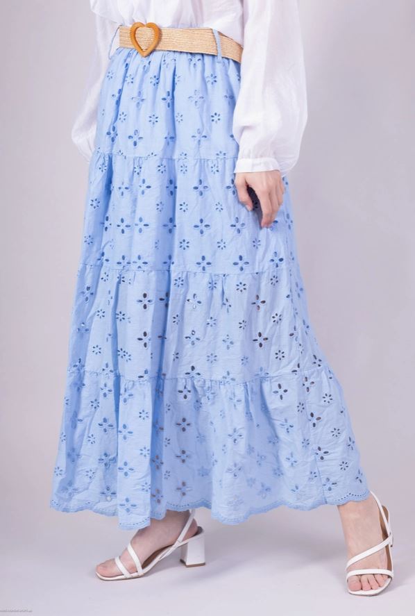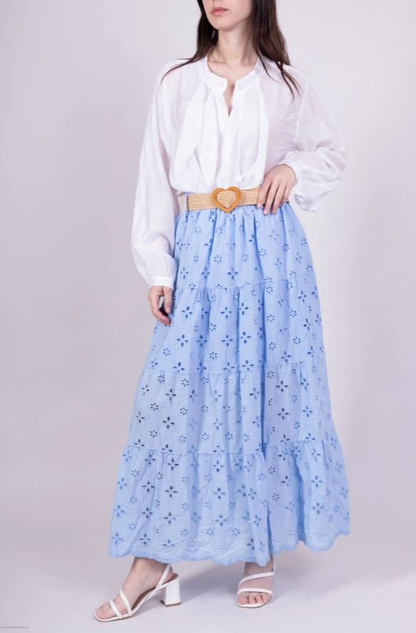 Lång kjol med engelsk brodyr, ljusblå - fodrad 100% bomull