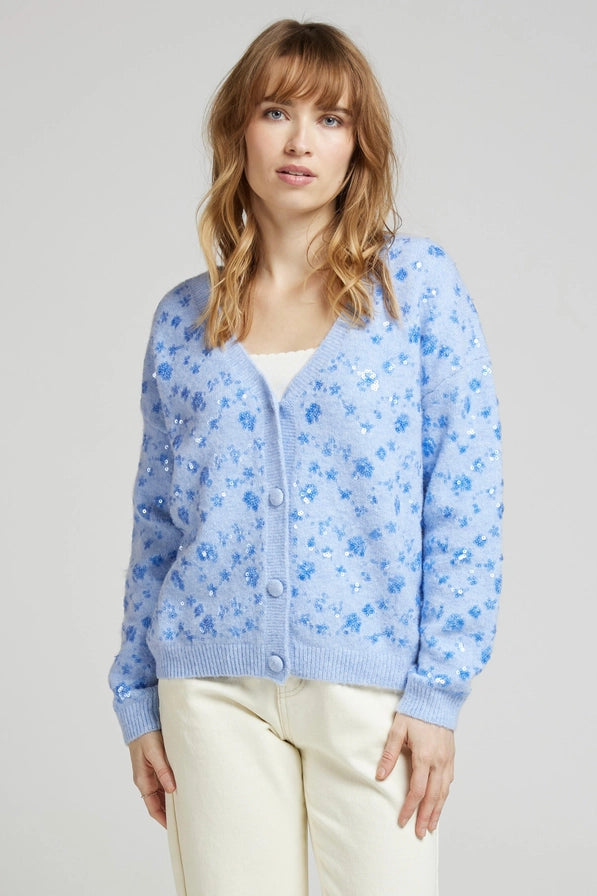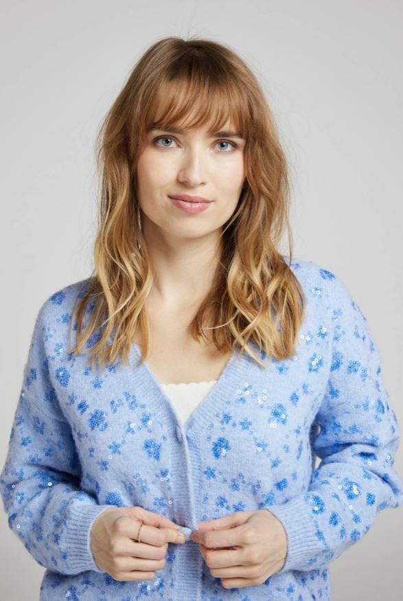 Elegant väst prydd med blommiga paljetter och täckta knappar, tillverkad i en mjuk blandning av akryl, polyester, ull och elastan för optimal komfort.