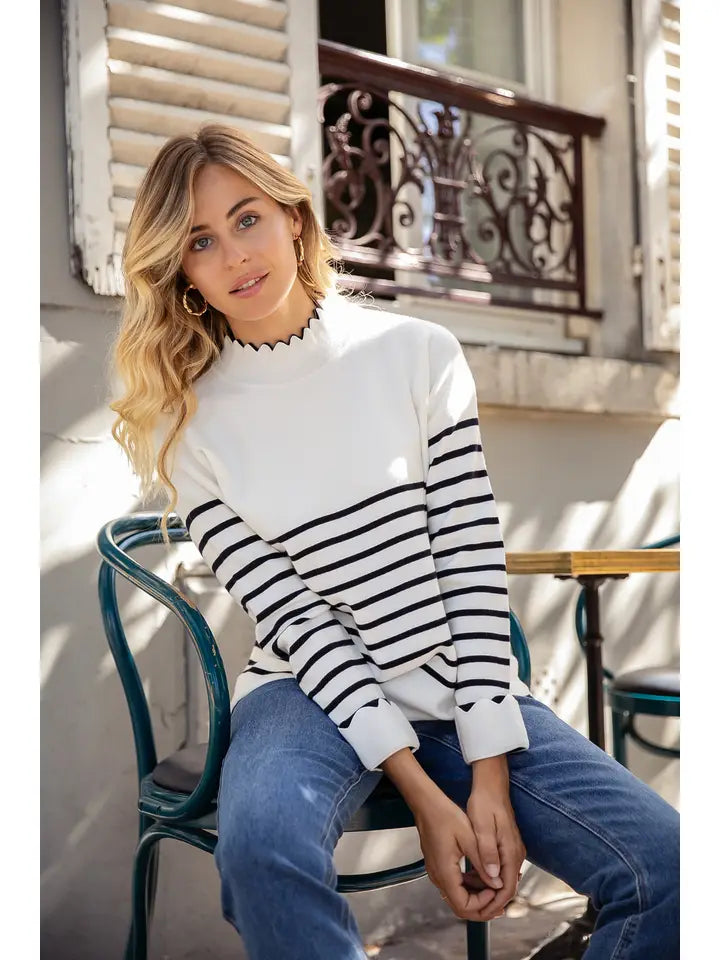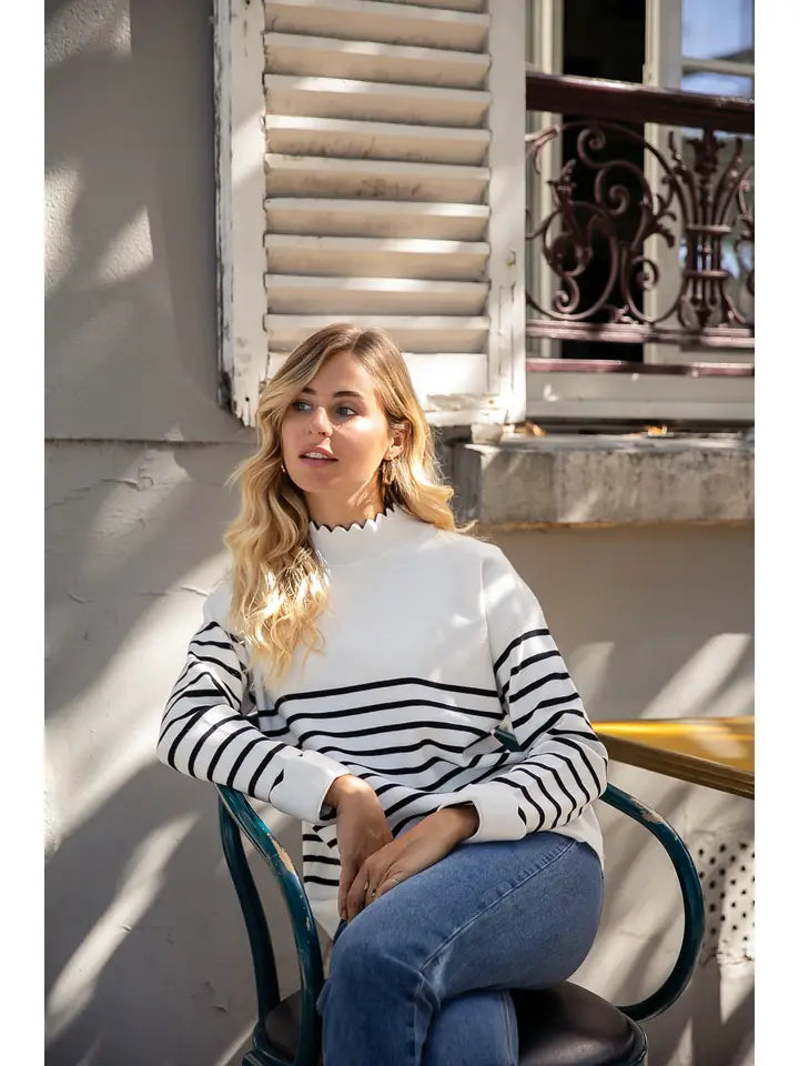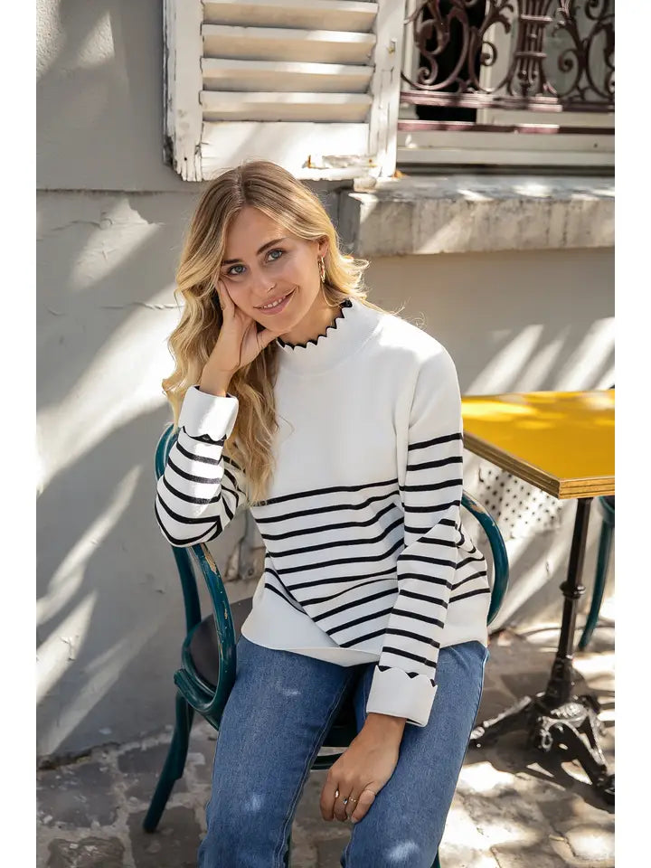 Vitblå tröja, Hög krage, Scallopdetaljer på kragen och ärmsluten.