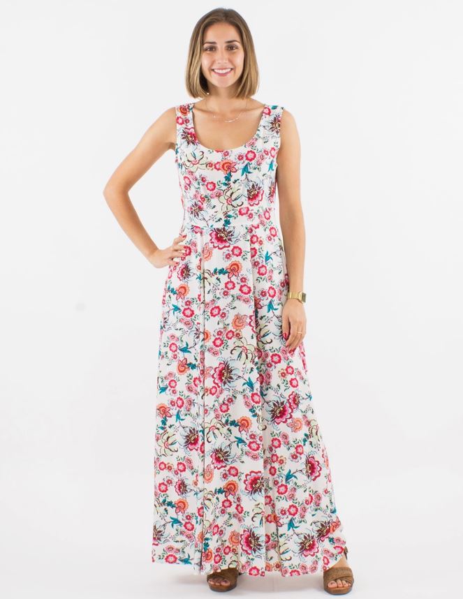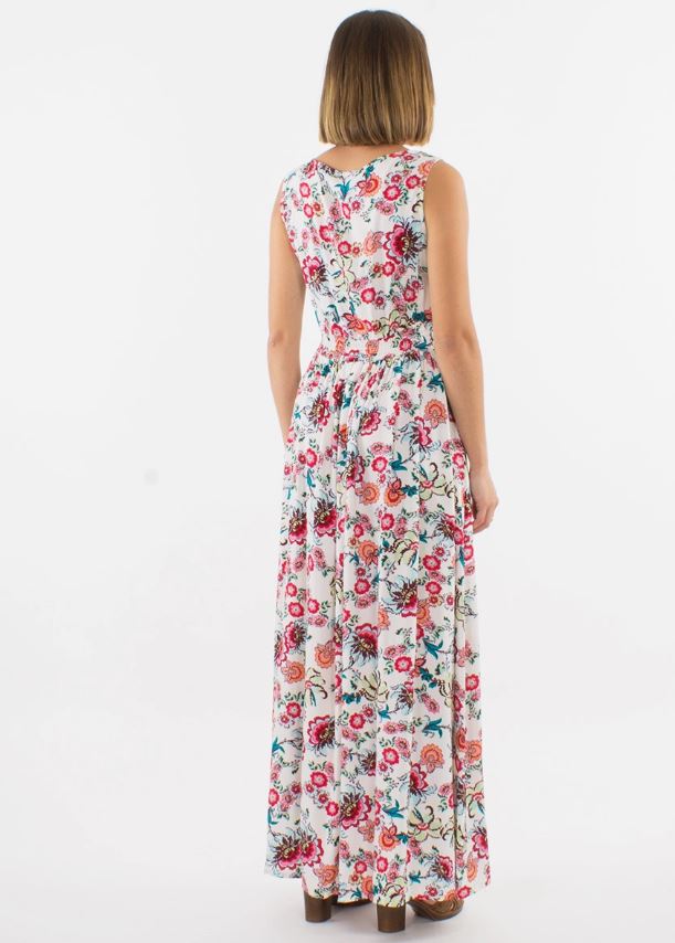 Dröm dig bort till varma sommardagar i denna romantiska, blommiga maxiklänning i bohemisk stil. Den luftiga, flödande silhuetten ger en mjuk och feminin känsla, medan det vackra blomstertrycket skapar en tidlös och avslappnad elegans. Tillverkad i 100 % viskos som känns lätt och sval mot huden – perfekt för soliga dagar, sommarfester eller en promenad på stranden. En klänning att älska, om och om igen.