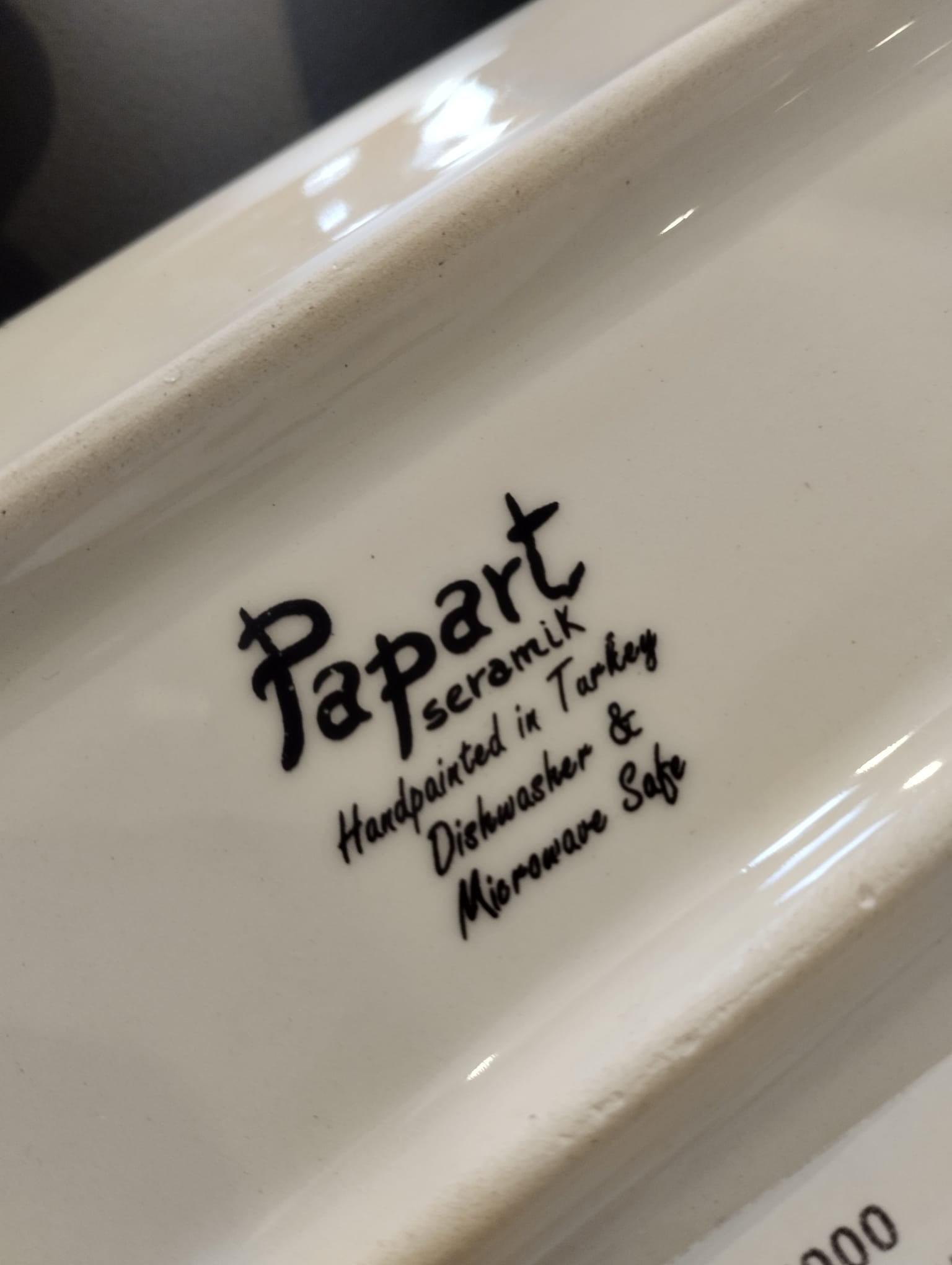 Varje fat är tillverkat i Turkiet, känt för sitt hantverk och sin långa keramiktradition. Materialet är robust keramik som både är hållbart och lätt att rengöra, vilket gör serveringsfatet lika praktiskt som det är dekorativt.