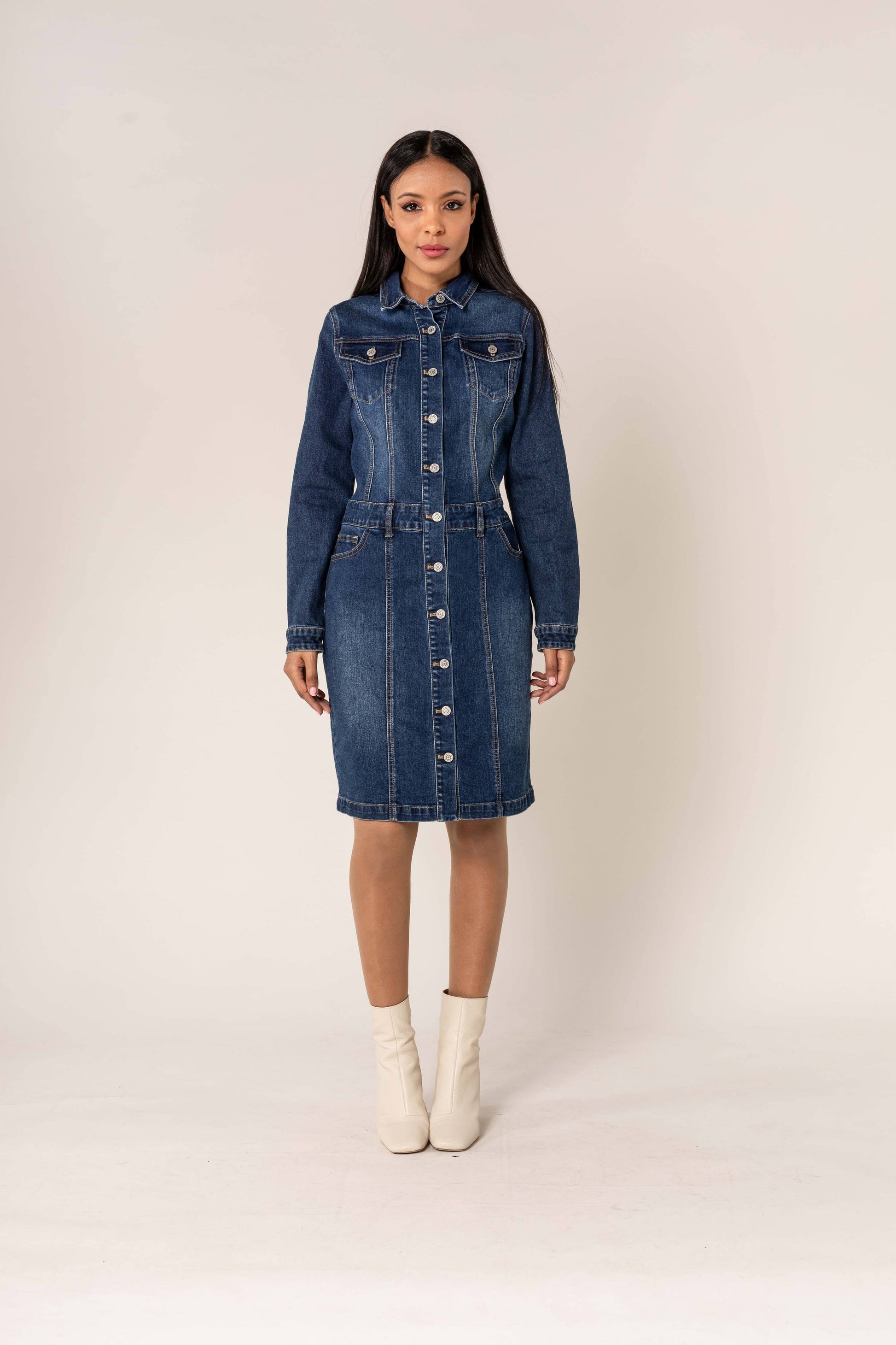 Stretchknäppt långärmad denimklänning för maximal komfort.