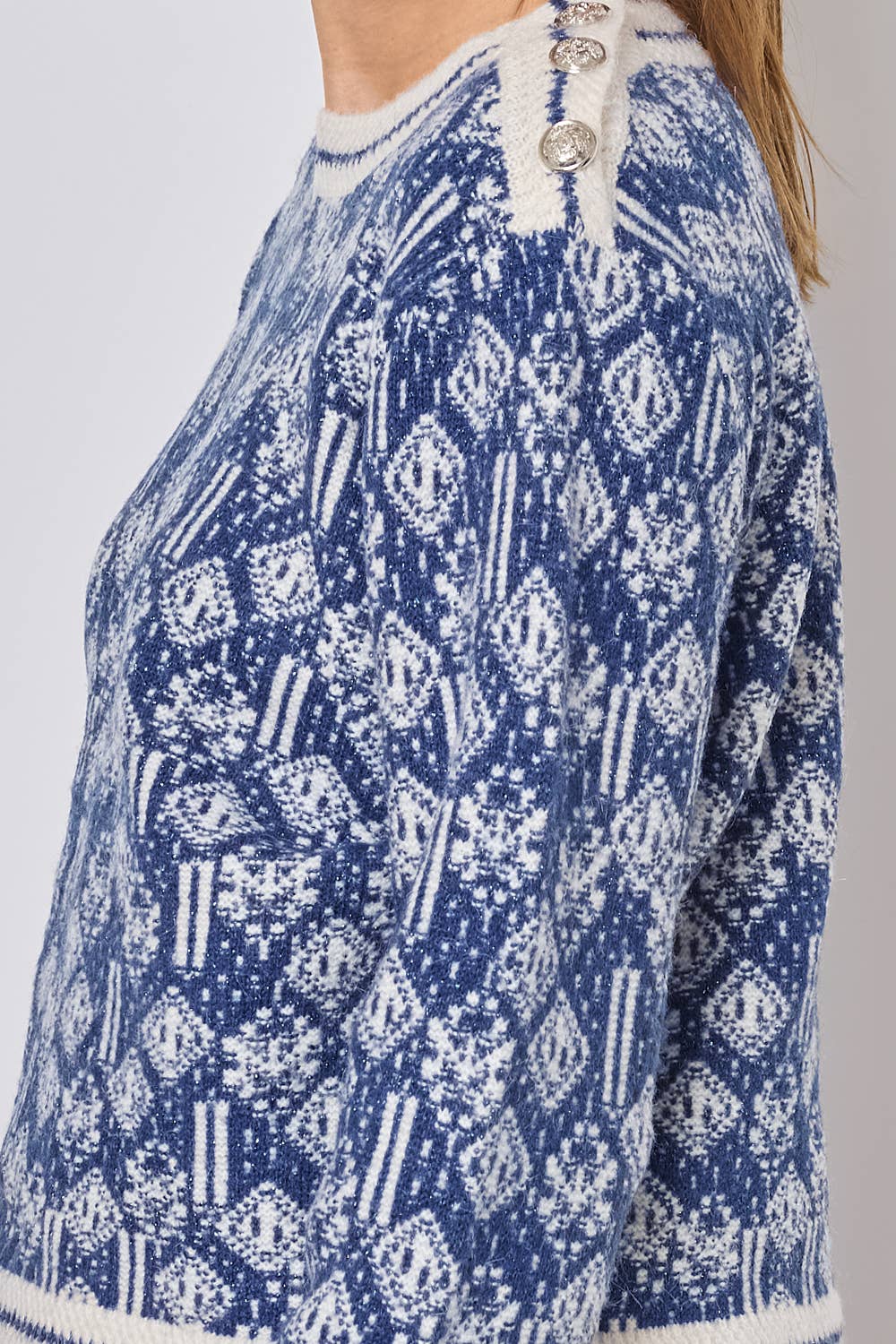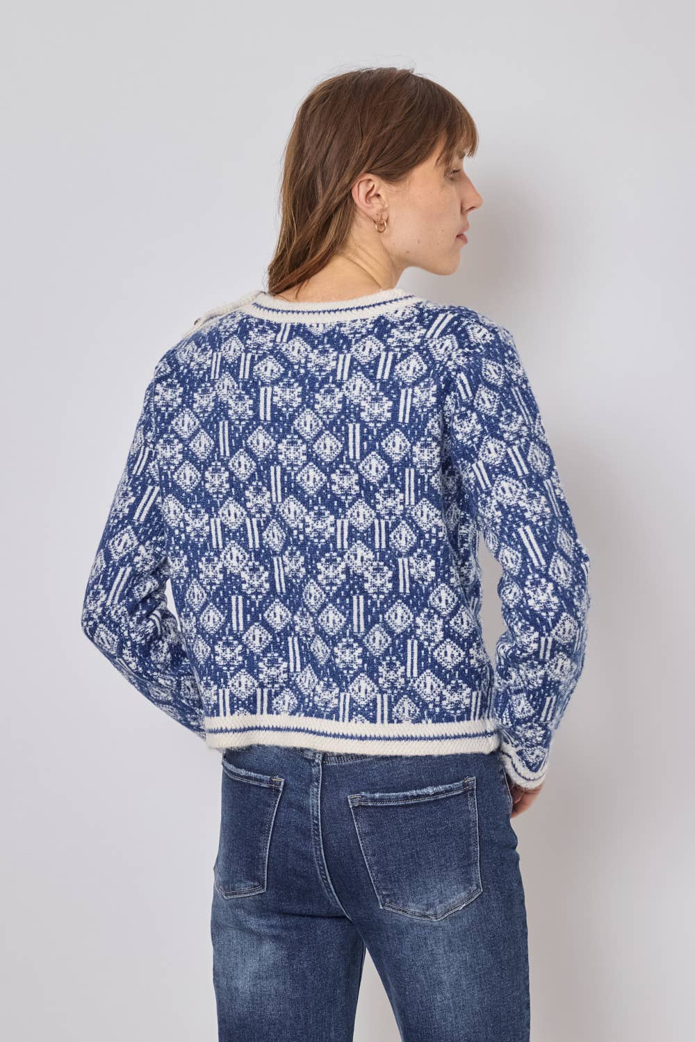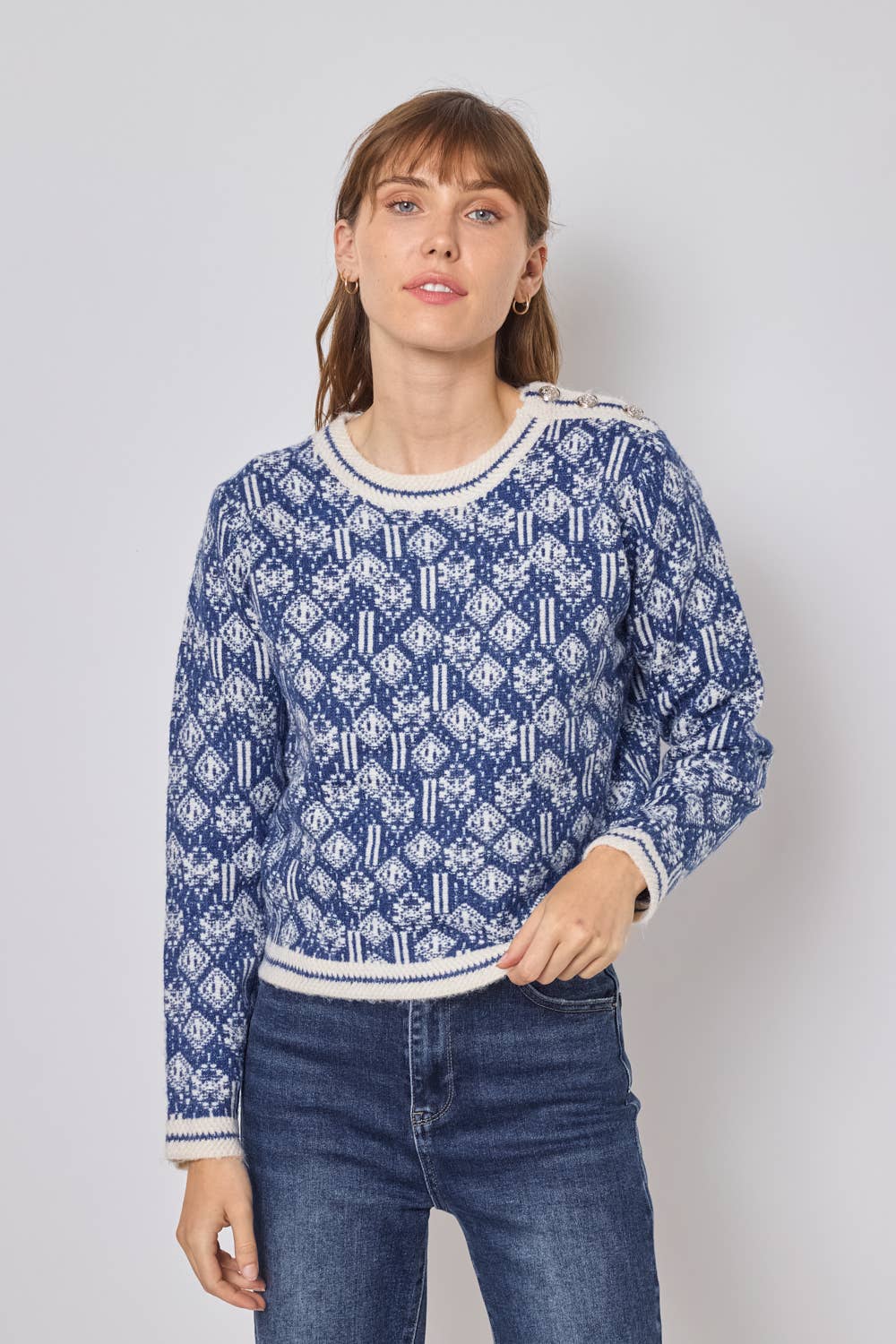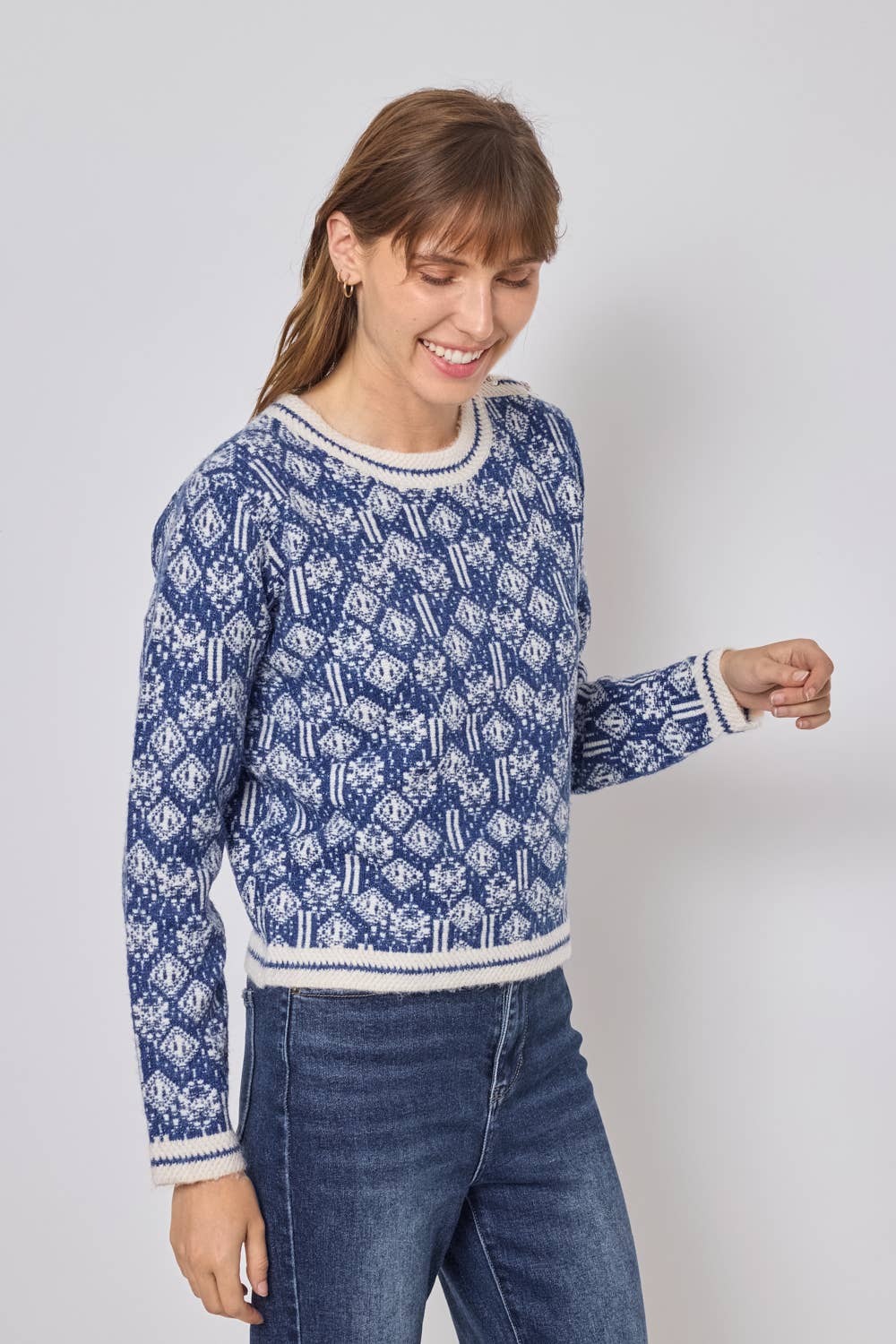 Tryckt stickad tröja med rund halsringning. Ett skimrande blått garn löper genom det vit-blå mönstret och ger tröjan en elegant touch.
