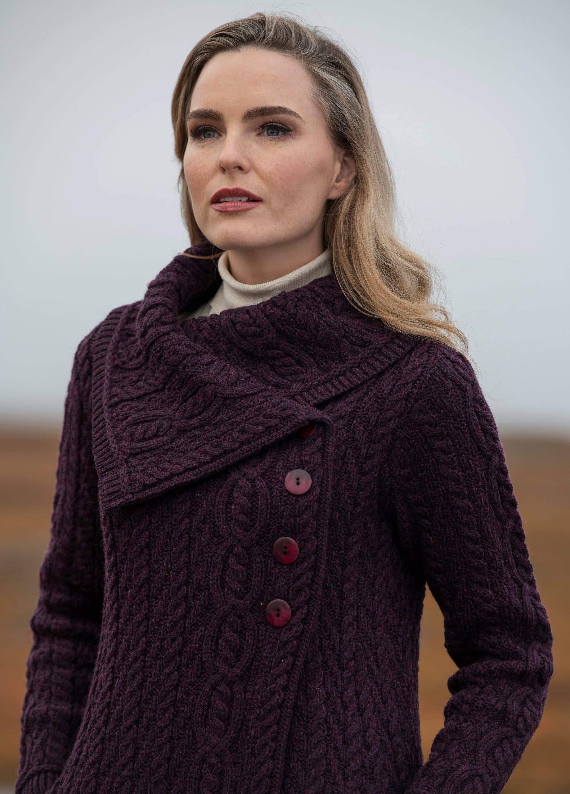 En chunky tröjjacka i 3/4-längd med elegant krage, knäppning framtill och praktiska infällda fickor. Plagget är stickat med en vacker blandning av traditionella Aran-flätmönster, vilket ger en tidlös och klassisk stil med en modern touch.
