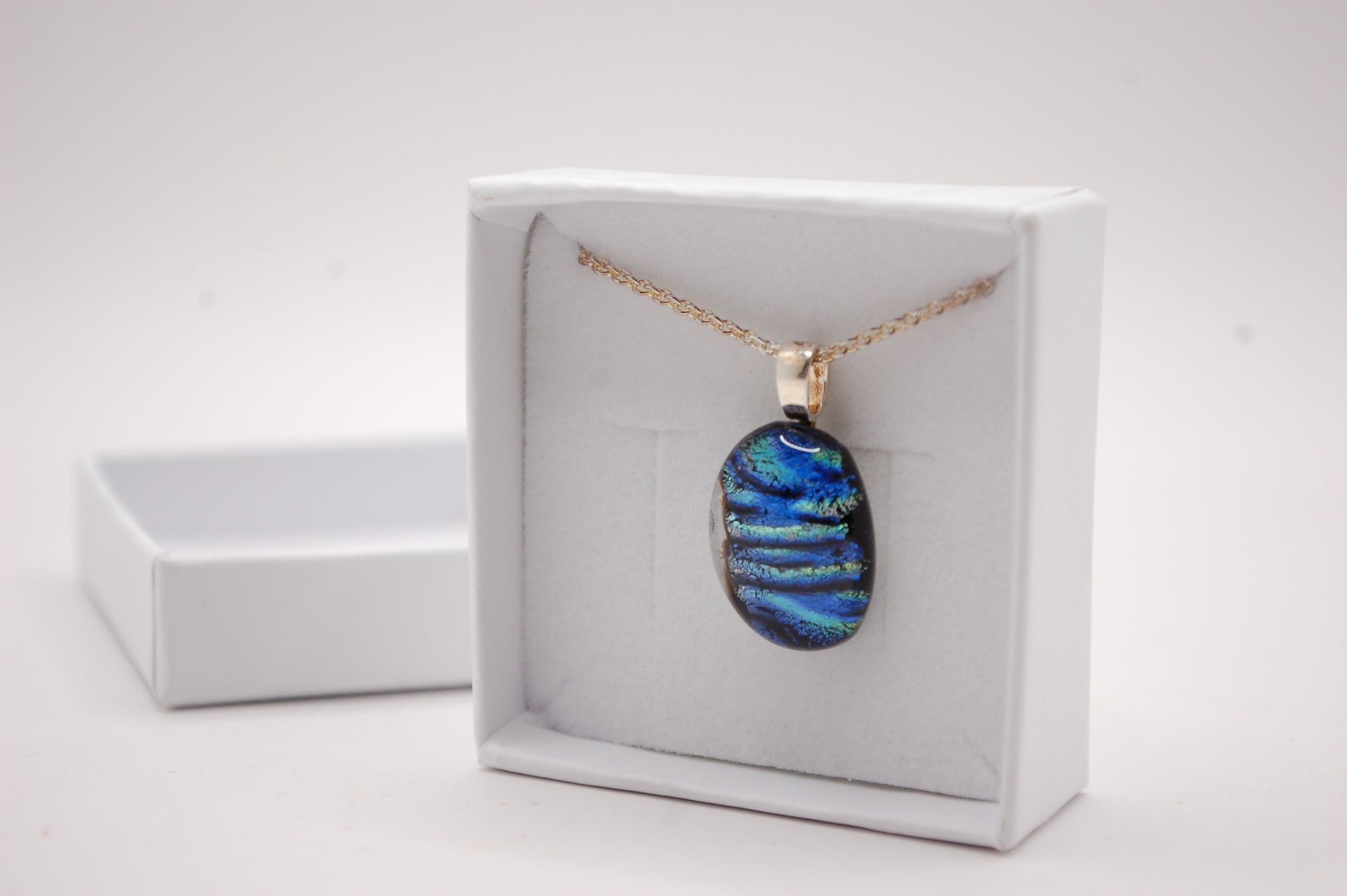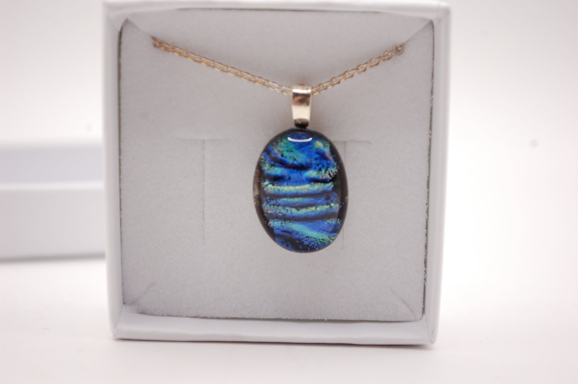 Elegant halskedja med litet hänge i dichroiskt glas. Hänget skimrar i skiftande blå och gröna toner beroende på hur ljuset faller – ett unikt smycke som påminner om havets djup och naturens magi.