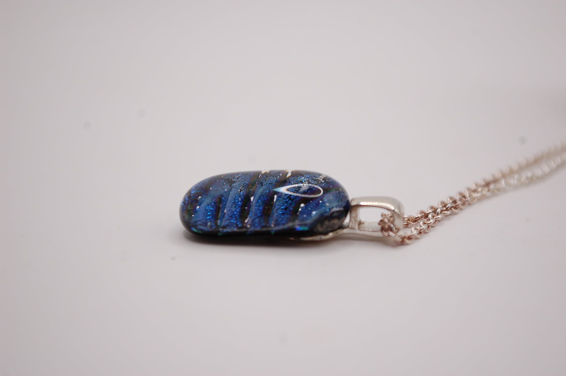 Elegant halskedja med litet hänge i dichroiskt glas. Hänget skimrar i olika blå nyanser beroende på hur ljuset faller – ett unikt smycke som för tankarna till havets djup och himlens skiftningar.