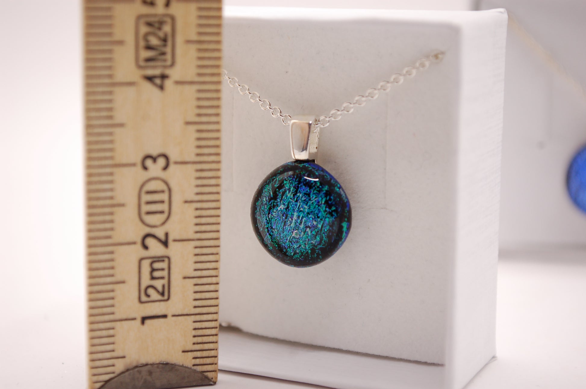 Halskedja - Litet Glashänge - Dichroic Glas - Rund Grön/Blå - Silver