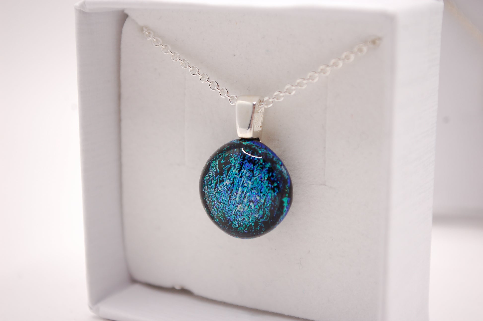 Elegant halskedja med litet hänge i dichroiskt glas. Glaset skimrar i grönt eller blått beroende på hur ljuset faller – ett unikt smycke som fångar ljuset och drar blickarna till sig.
