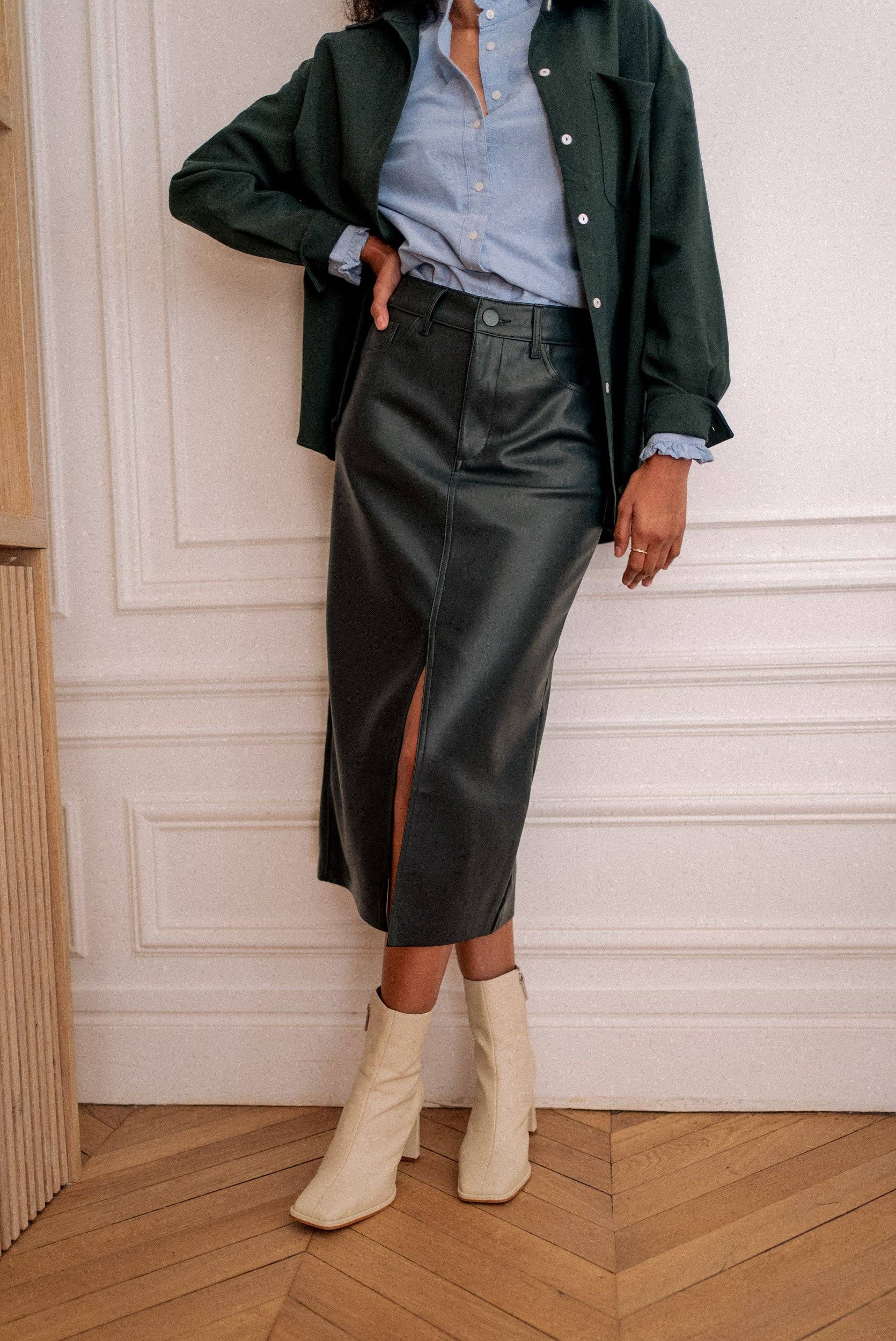 Kyle-kjolen är en elegant midikjol i pennmodell, tillverkad i mjukt och stilrent konstläder. Den höga midjan ger en smickrande siluett och gör kjolen enkel att kombinera både till vardag och fest. Försedd med dragkedja och knappstängning framtill samt praktiska bältesöglor för att enkelt kunna styla med ditt favoritbälte.