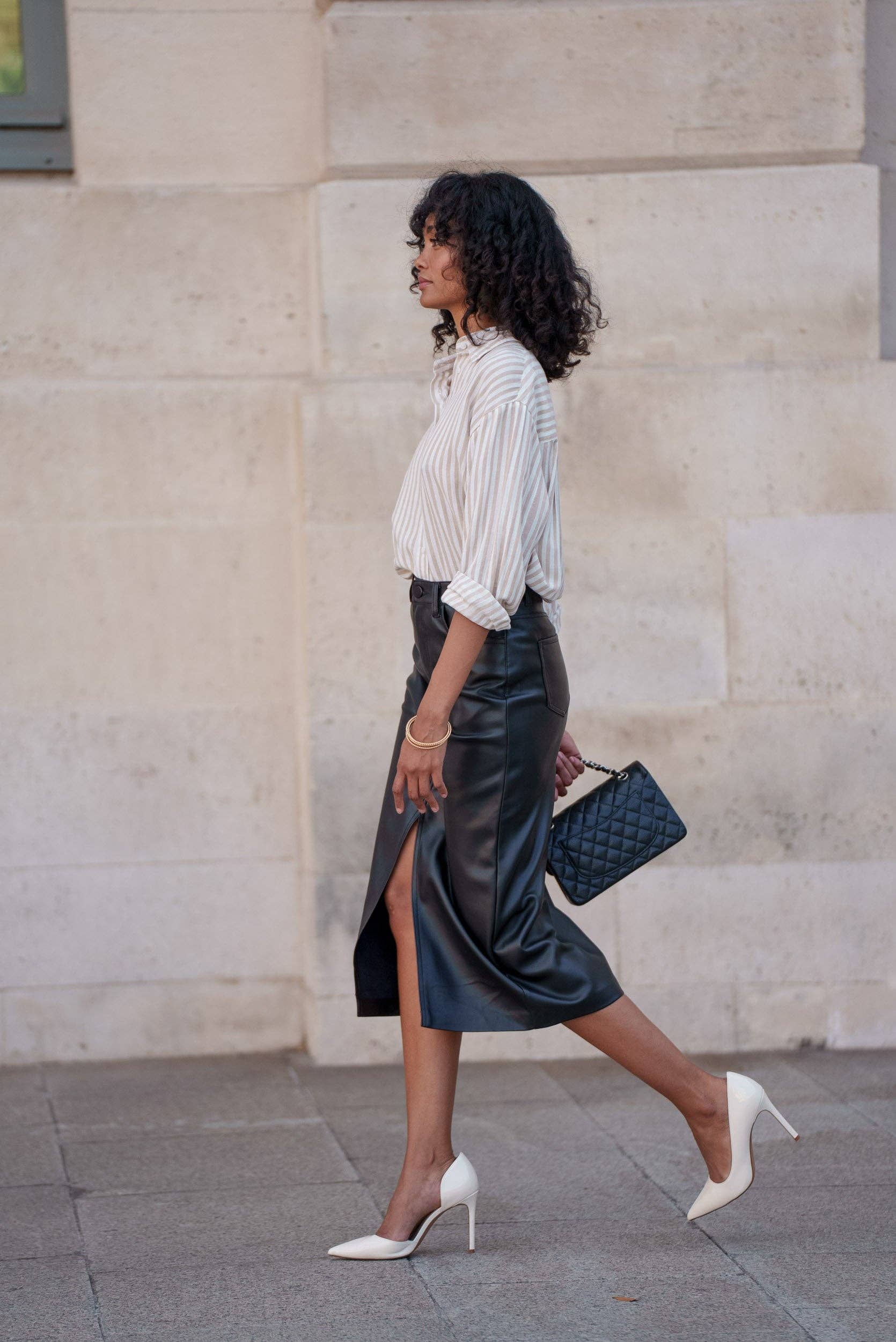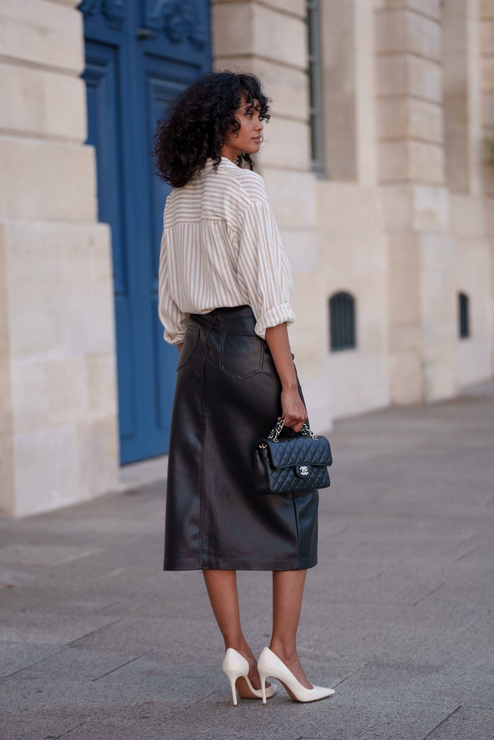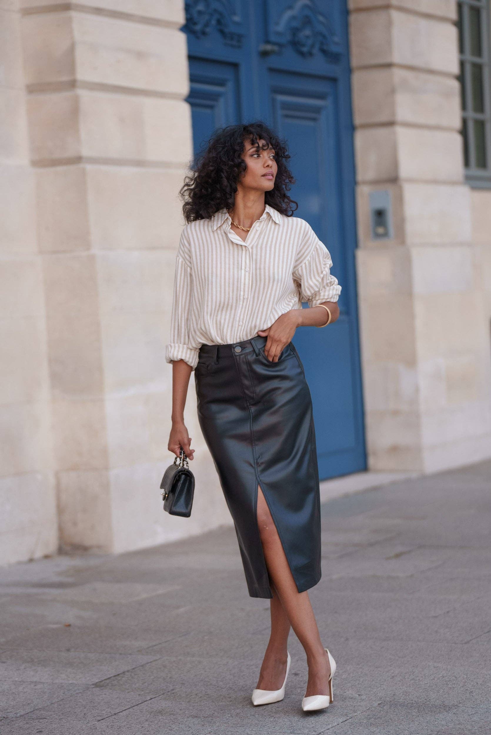 Kyle-kjolen är en midikjol i pennmodell i konstläder: