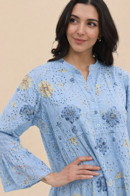 Klänning m. blommönster i 100 % bomull : Himmel Blå