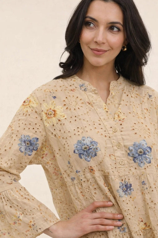 Klänning m. blommönster i 100 % bomull : Kamel