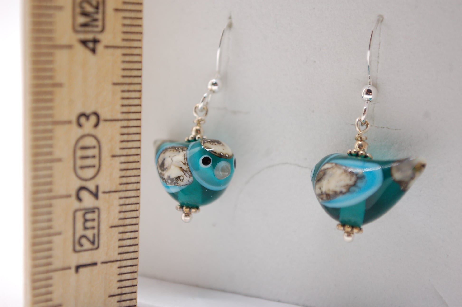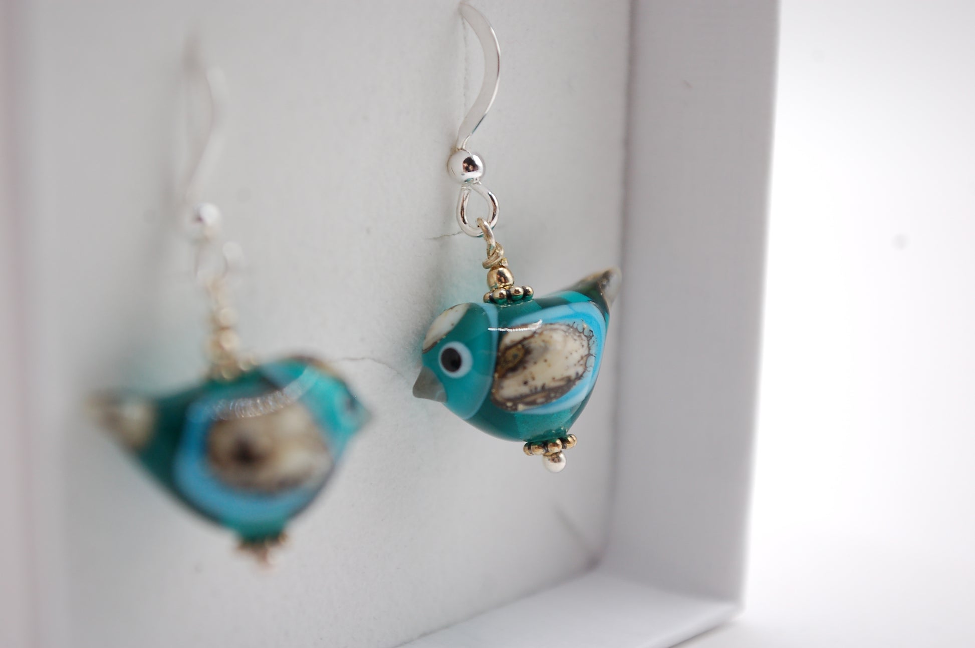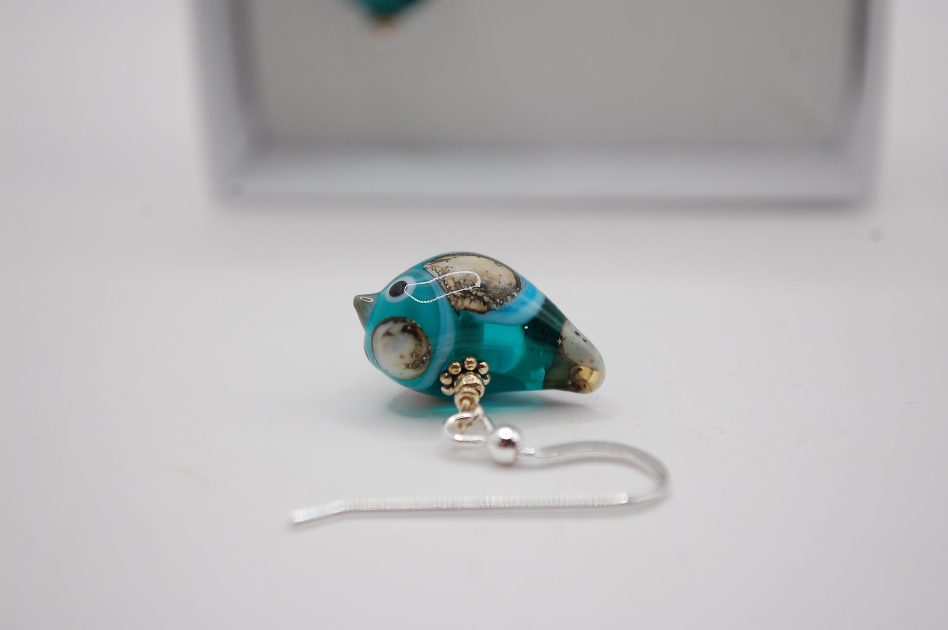 "Detta unika set örhängen har en vacker handgjord glaspärla i form av en små fågel. Den är skapad med stor omsorg i min lilla lampwork-ateljé, belägen djupt inne i Smålands skogar.