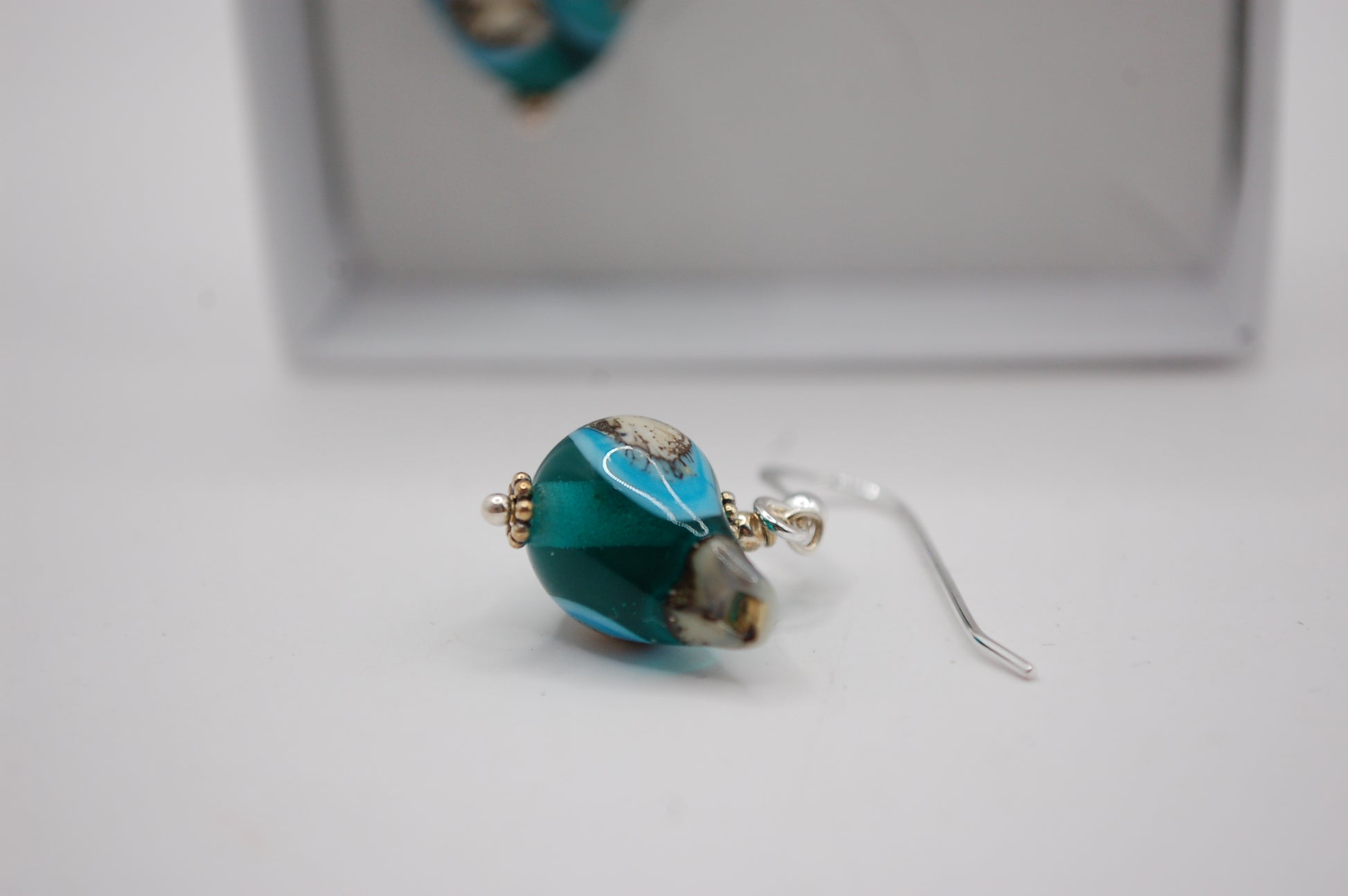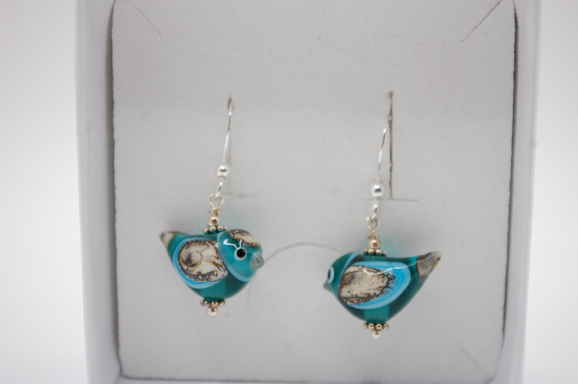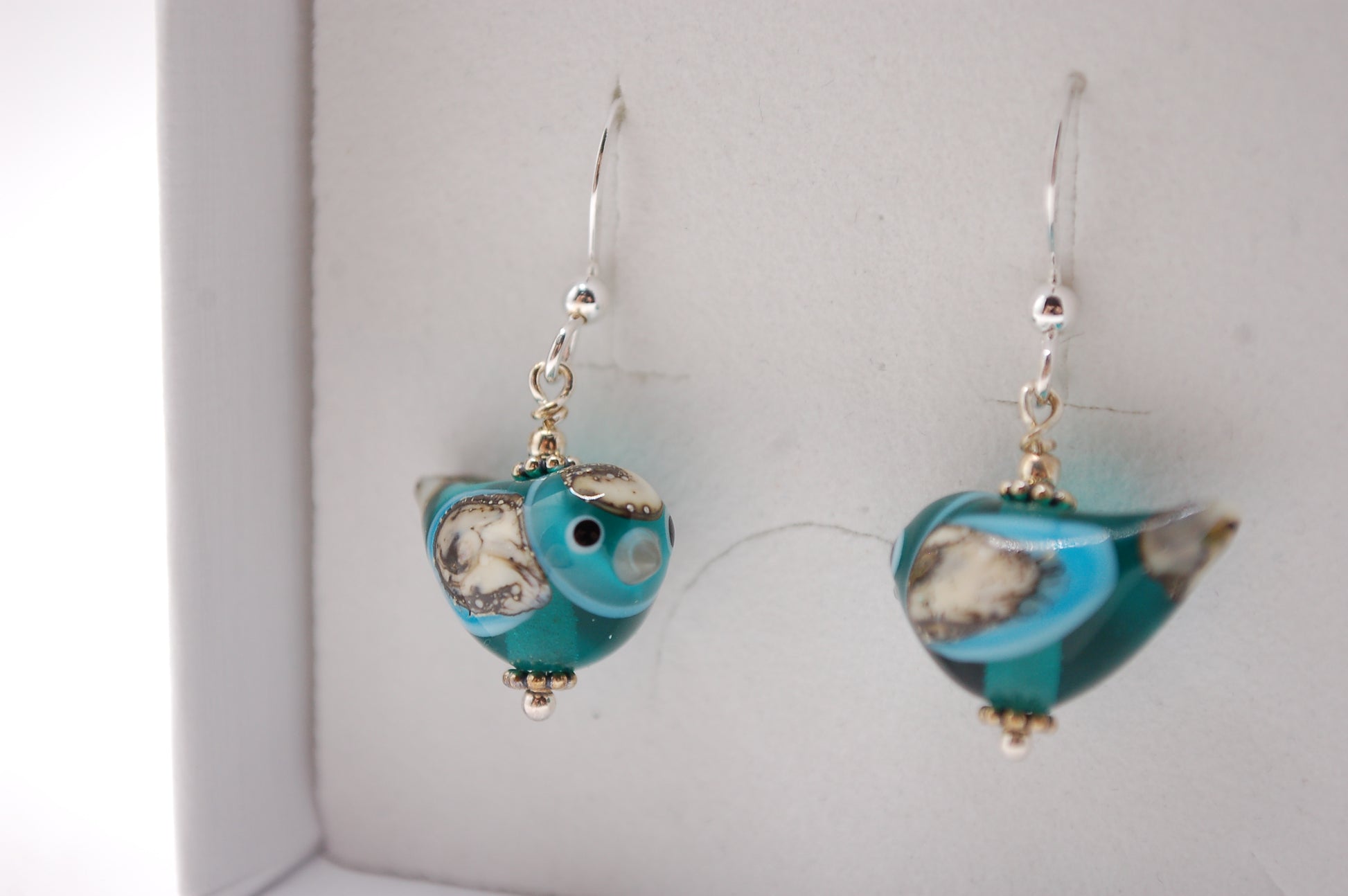 "Detta unika set örhängen har en vacker handgjord glaspärla i form av en små fågel. Den är skapad med stor omsorg i min lilla lampwork-ateljé, belägen djupt inne i Smålands skogar.