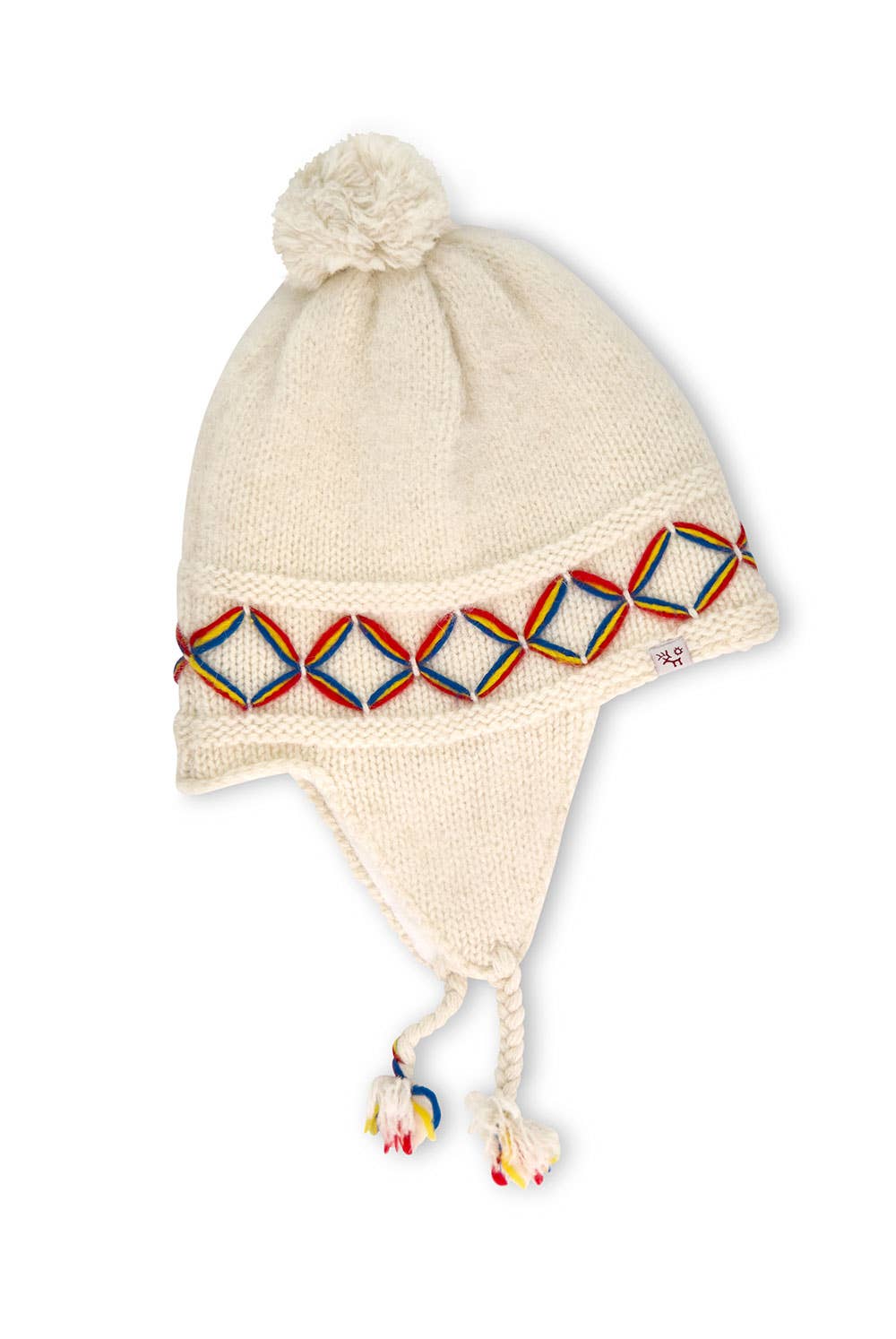 Varm Lovikka mössa i nordiskt mönster med tofs på huvudet och örsnibbar.