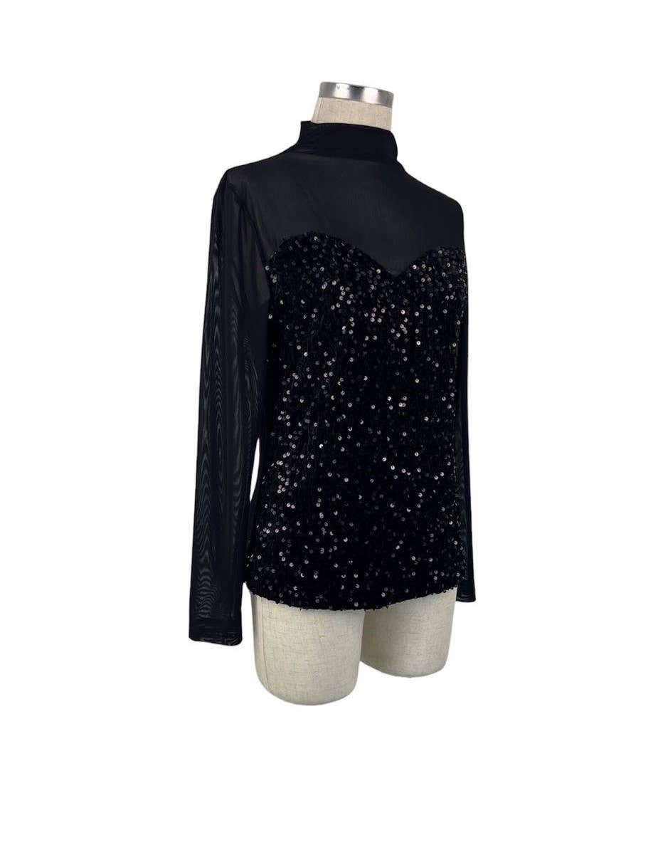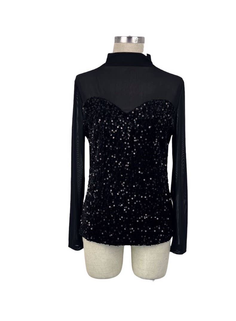 Lyft varje outfit med denna eleganta långärmade topp, helt täckt av glittrande paljetter som skapar ett lyxigt och festligt uttryck. Den sofistikerade ståkragen ger ett stilrent och modernt intryck, perfekt för både festkvällen och mer uppklädda vardagsstunder.