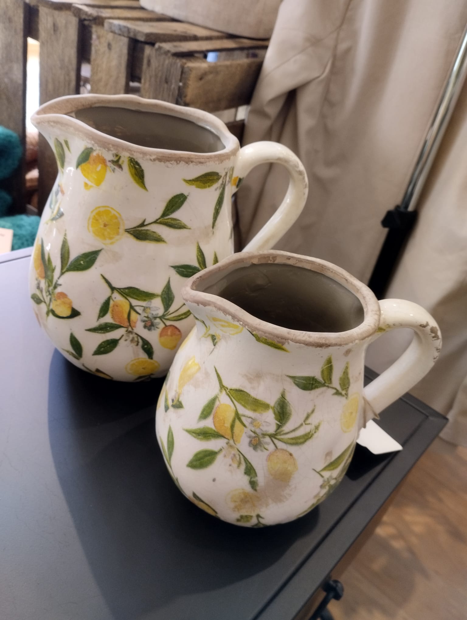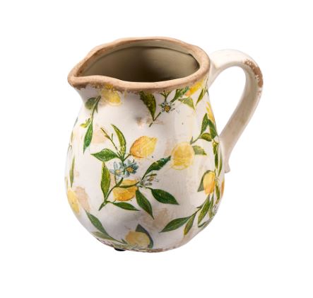 Kannan är utsmyckad med ett livfullt citronmotiv som för tankarna till soliga dagar vid Medelhavet. De friska gula och gröna tonerna skapar en harmonisk kontrast mot den glansiga keramiken och gör vattenkannan till mer än bara ett redskap – den blir en dekorativ detalj i hemmet eller på balkongen.