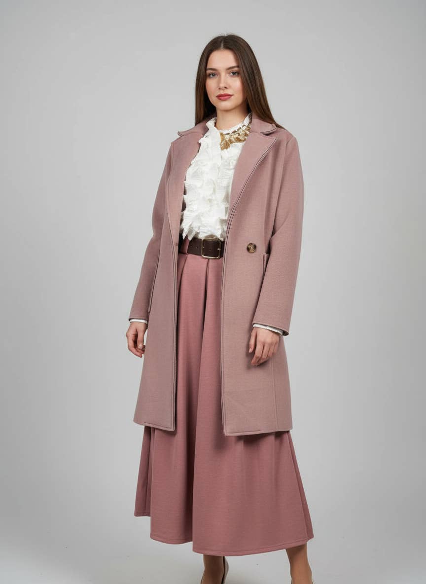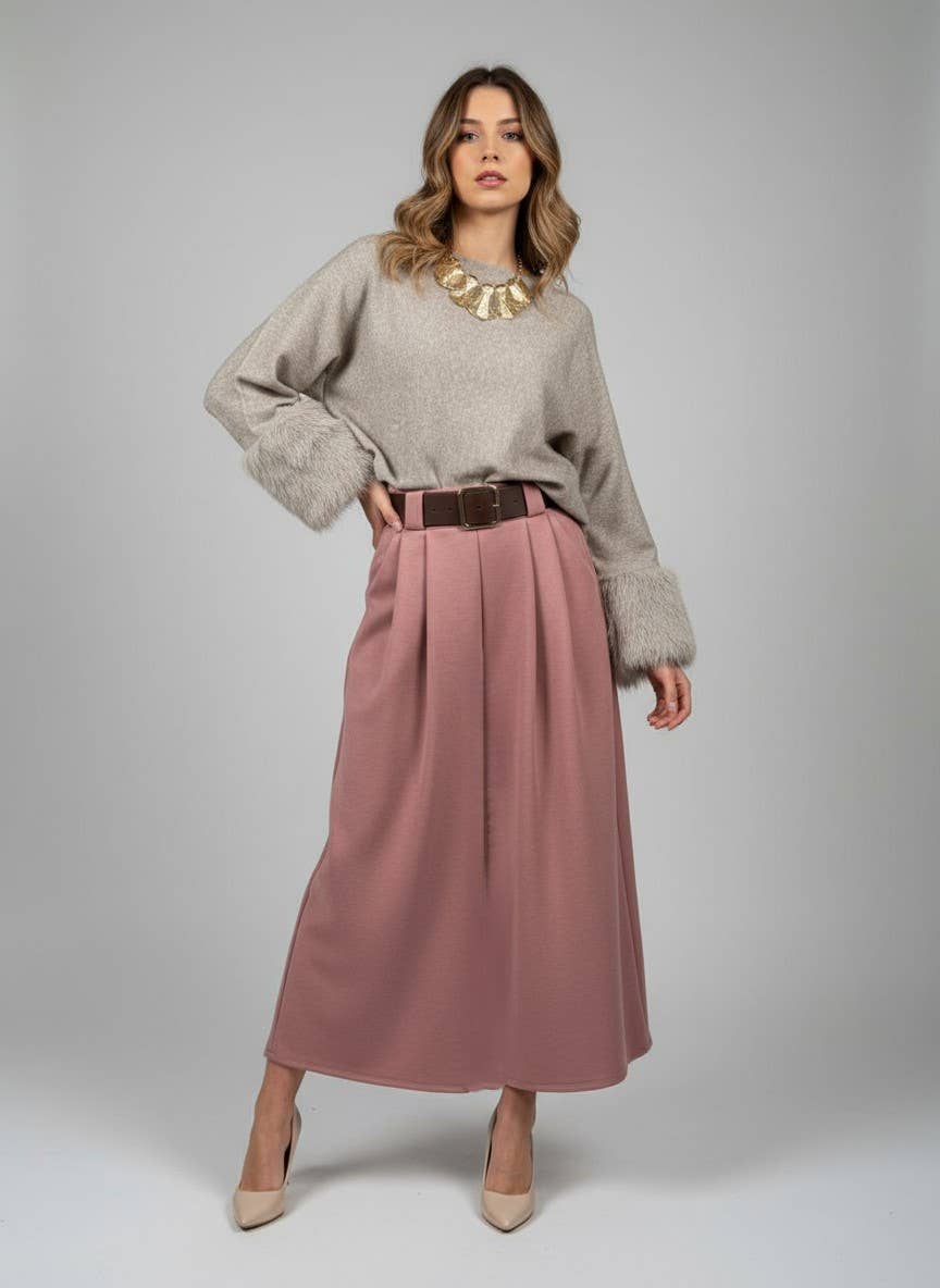 Imponerande lång kjol gjord av mockaliknande material, med en mjuk textur och elegant utseende. Den har ett bälte i midjan som framhäver silhuetten och praktiska fickor som ger en modern, avslappnad-chic karaktär. Ett mångsidigt plagg, perfekt för vardagliga eller mer sofistikerade stilar, som kombinerar komfort med tidlös finess. 🤎✨